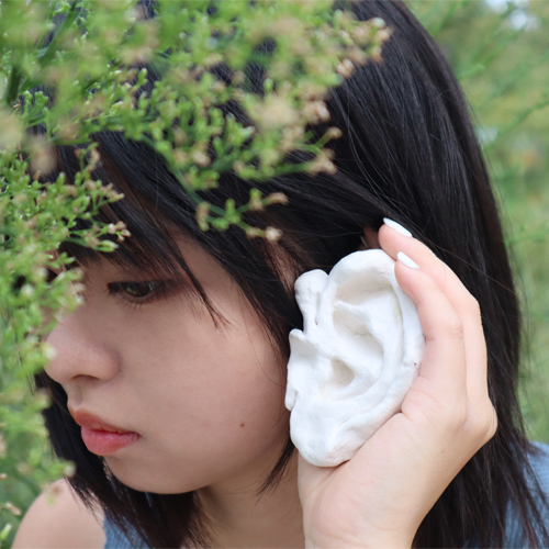 2003年長崎県生まれ。サウンド、パフォーマンス、インスタレーションを主に創作活動を行っている。心身の欠損をテーマに、幼少期の聴覚異常や片耳の難聴をもとにした制作を続けている。雑音や歌声など数多の音を「きく」行為として聴覚だけを用いるのではなく、触覚や視覚から捉える作品を展開し、サウンドやドローイングによって欠損から生まれる現象を記録している。