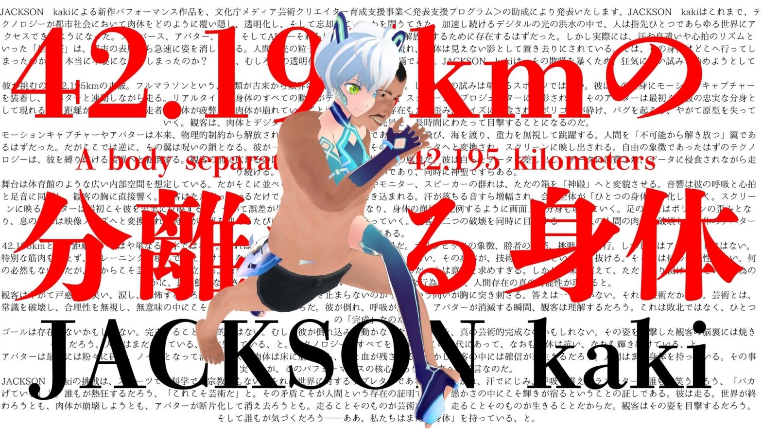 肉体にモーションキャプチャーをつけ、アバターとともにフルマラソン42.195kmを走破する新作パフォーマンスを実施する。テクノロジーが切り離した身体や時間・空間の制約に、あえて肉体を酷使して向き合うことで、もう一つの人間とテクノロジーの共存のあり方を提示する。限界を越えて走り続ける彼の姿とリアルタイムで変容するアバターの映像が、芸術と人間存在の可能性を問いかける。
