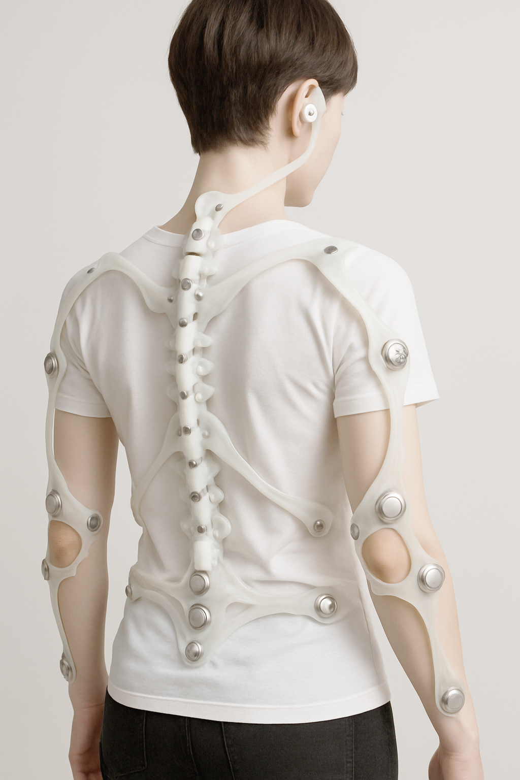 AI生成の動作を装着者に微細な振動として伝えるウェアラブル作品を制作。脳波を入力にLLM(大規模言語モデル)が奇妙な動作を生成し、外骨格ではなく「触れられる感覚」として身体に返す。ステラークや森万里子の先行例を参照しつつ、制御や補強としてではなく、装着者とAIがともに創発される柔らかな主体性を提示することで、未来のヒト—AI共生インターフェースを探る。