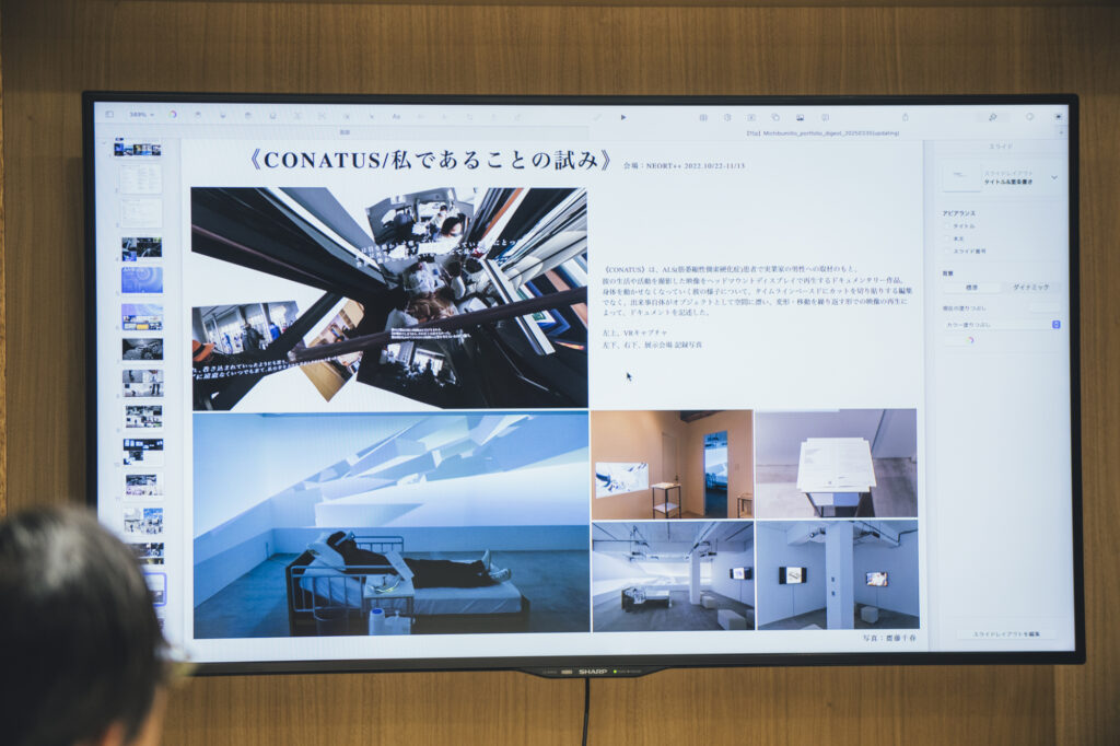 伊藤さんはこれらのアドバイスを受け止めながら「テクノロジーをつくり出すときに生まれる、『夢』がなくなっていく状況を切実にに表現したい」と制作のモチベーションを改めて述べ、初回面談は終了しました。