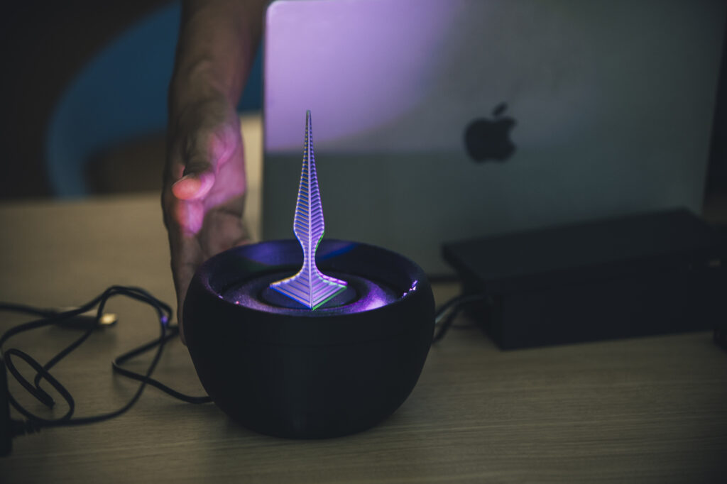 今回はプロトタイプとして、密教で用いられる法具から着想を得たという作品『顫杵(せんしょ)』を持参。動く様子をアドバイザーに披露しました。アンビエントな音と共に、グリッチや色収差といった視覚効果が目前の立体物に現れます。