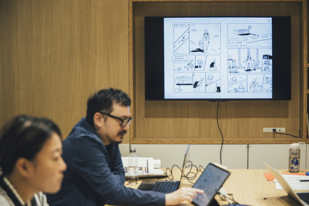 「語学にフォーカスしてみては」と、口火を切ったのはアドバイザーのモンノカヅエさんです。学習マンガが好きで、歴史もマンガで学んだというモンノさん。しかし海外にはそういった媒体があまりなく、オランダで暮らした際には言語を学ぶのに苦労したと言います。「アメリカでは移民は絵本で英語を覚えるそう。タップすると異なる言語に切り替わる機能などを付加して、語学教材の需要とマッチングさせてみてはどうか」と提案。事例として、マンガ作品を通して英語を学ぶアプリ「LANGAKU」などを紹介しました。必要最低限の端的な言葉が散りばめられた『あしたのさんぽ』。小学生などがこの作品を通して英単語を学ぶ姿などは、想像に難しくありません。一方で、「語学に着目するなら、むしろもう少し言葉を増やしてもいい」という意見も出ました。