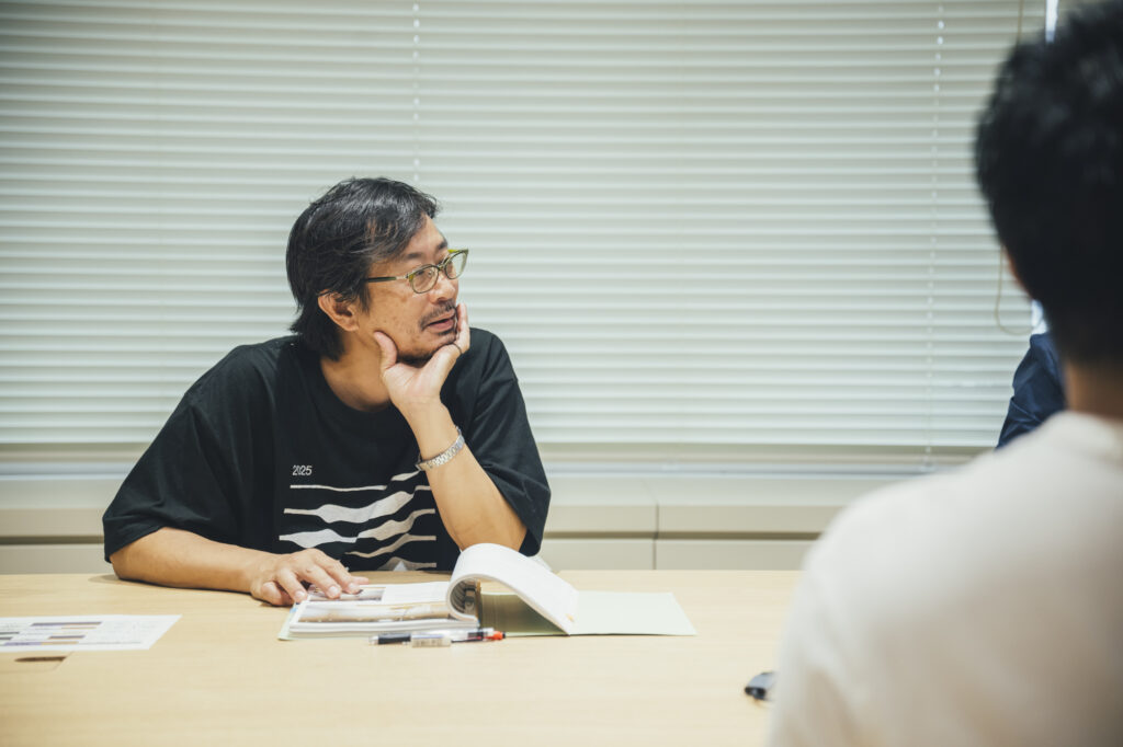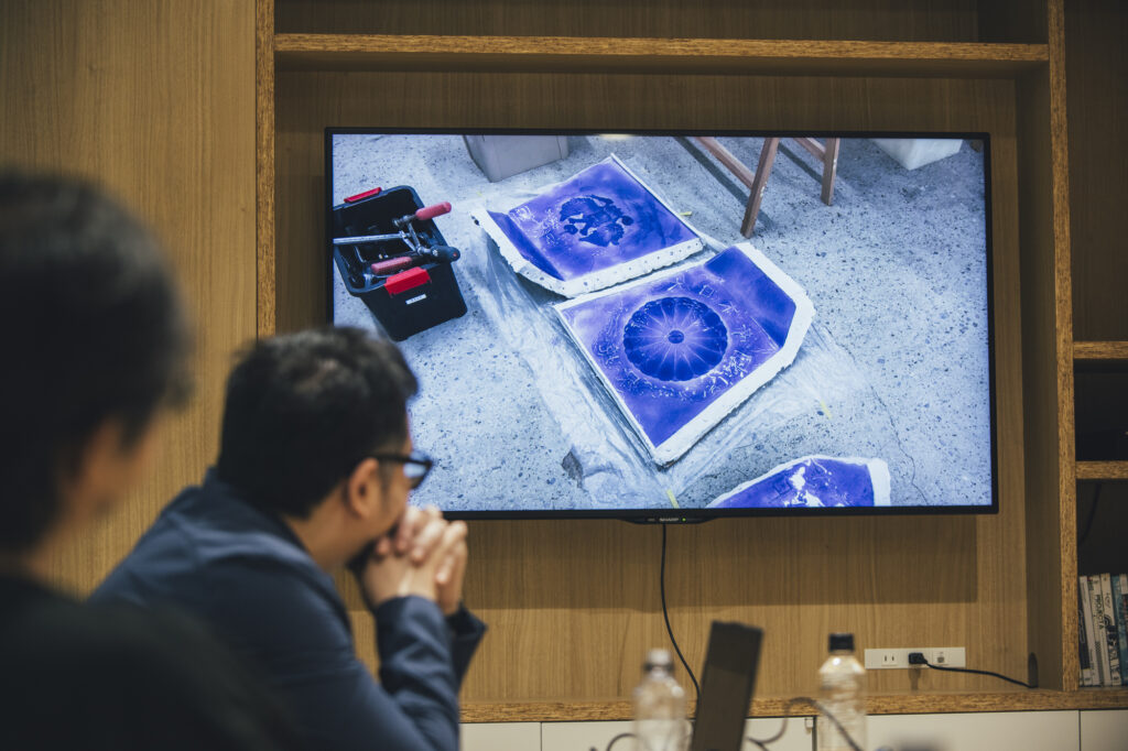文化と歴史的背景を踏まえたモチーフの変遷や社会的文脈に着目し、作品のあり方を探求する冬木遼太郎さん。今回冬木さんが着目したのは、1905年の日露戦争終結時、ロシア(当時ロシア帝国)と日本の国境を示すために設置された国境標石、そのレプリカです。冬木さんはレプリカをさらに複製し、オブジェクトが自律的に動くインスタレーション作品を制作予定です。面談では、冬木さんのこれまでの作品なども参照しながら問答が繰り広げられるとともに、オブジェクトの質感や動き方などについてディスカッションがなされました。