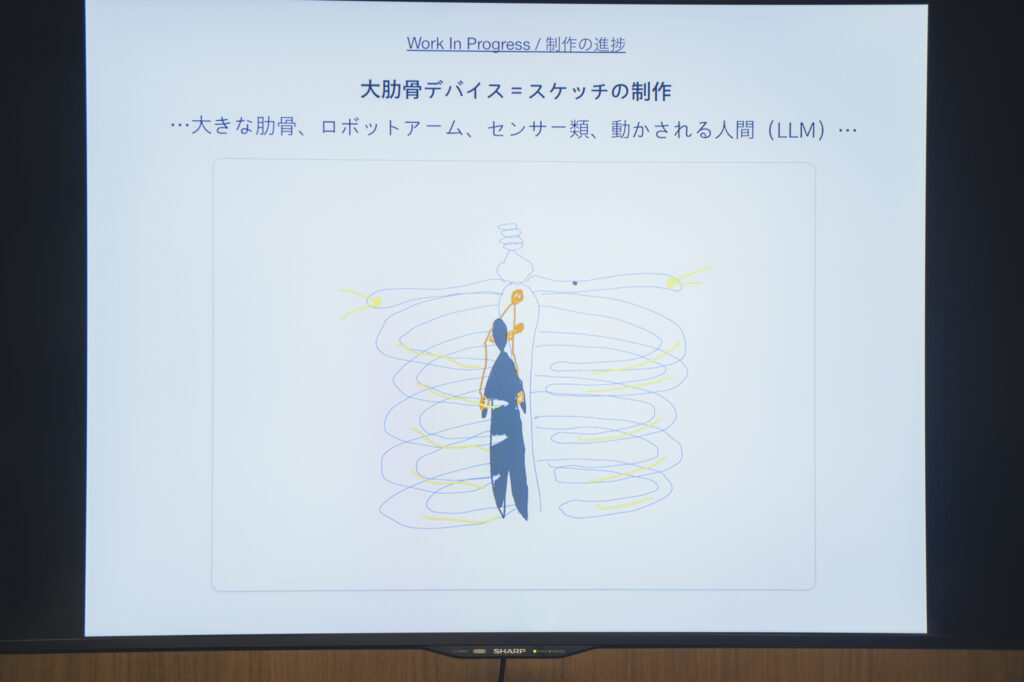 なぜ内臓なのか。それについて岸さんは「内臓は言語を使えません。だから自分が内臓になって、かつ隣の内臓がAIだったら、それは言葉を介するものとは別の出会いになるんじゃないかと思った」と述べます。そしてチームのメンバーとスケッチやリサーチを重ね、肋骨の骨組みやドーム的な形状を連想させる、高さ3メートルにも及ぶ立体を制作することが明かされました。この中にロボットアームが取り付けられ、身体が操作されるそうです。