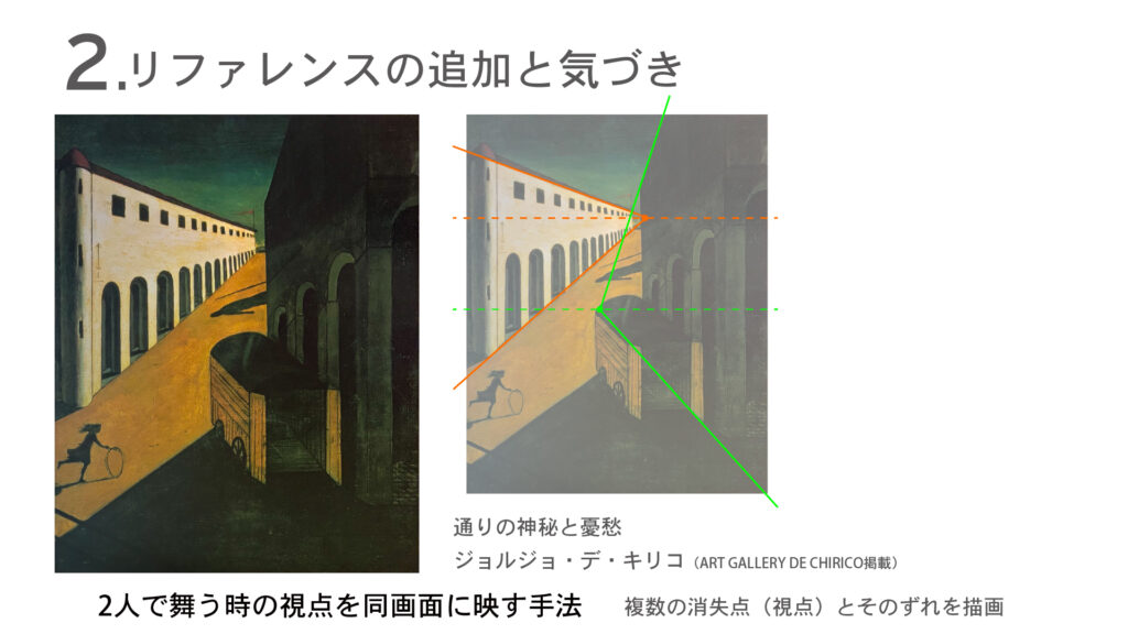 複数の視点を同じ画面に入れるに当たって、ジョルジョ・デ・キリコ「街の神秘と憂鬱」を参考に、複数の消失点を設定したいと話します。