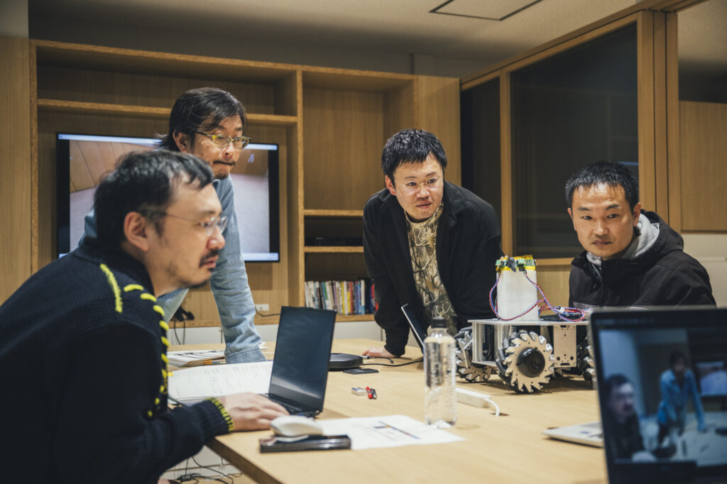 「本当はごく稀に壁にぶつかってほしい」と冬木さん。現状、人だけでなく壁に近づいた際も自ら避けて接触を避ける設定になっていますが、センサーで綺麗に避け続けるより、ぶつかってちょっと動作に支障が出ているくらいの状態がしっくりくるようです。また、「存在としても人からもう少し離れさせたい。見る人に、素通りしたり、飽きたりしてほしい」とも。伊藤さんも「人より長い時間軸のなかで動いているイメージ。動いているかいないかもすぐにはわからないような」と補足します。動作の幅やスピードはこれから改良予定とのことですが、具体的な動きが見えてきた分、作品のイメージもはっきりしてきたようです。